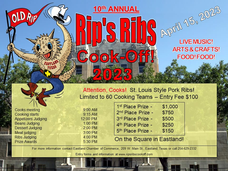 The Annual Rip's Ribs Cookoff is a great day in downtown Eastland to fire up your grill and make your famous Ribs with special rubs, sauces, spices, and more! Enjoy a variety of vendors along with more food options than you have room for in your stomach.