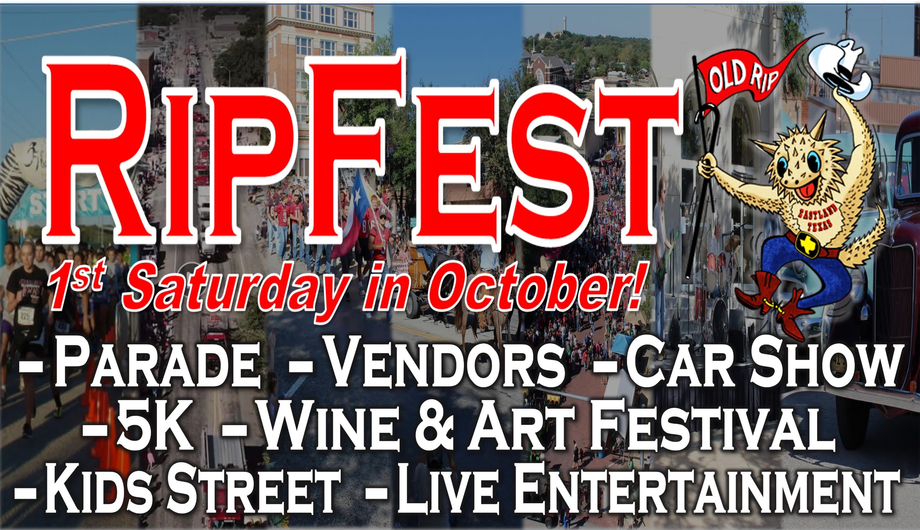 Everyone's favorite day in Eastland Texas includes Ripfest with a 5K race, a large parade, vendor booths, live entertainment, kids street, and tons of food!