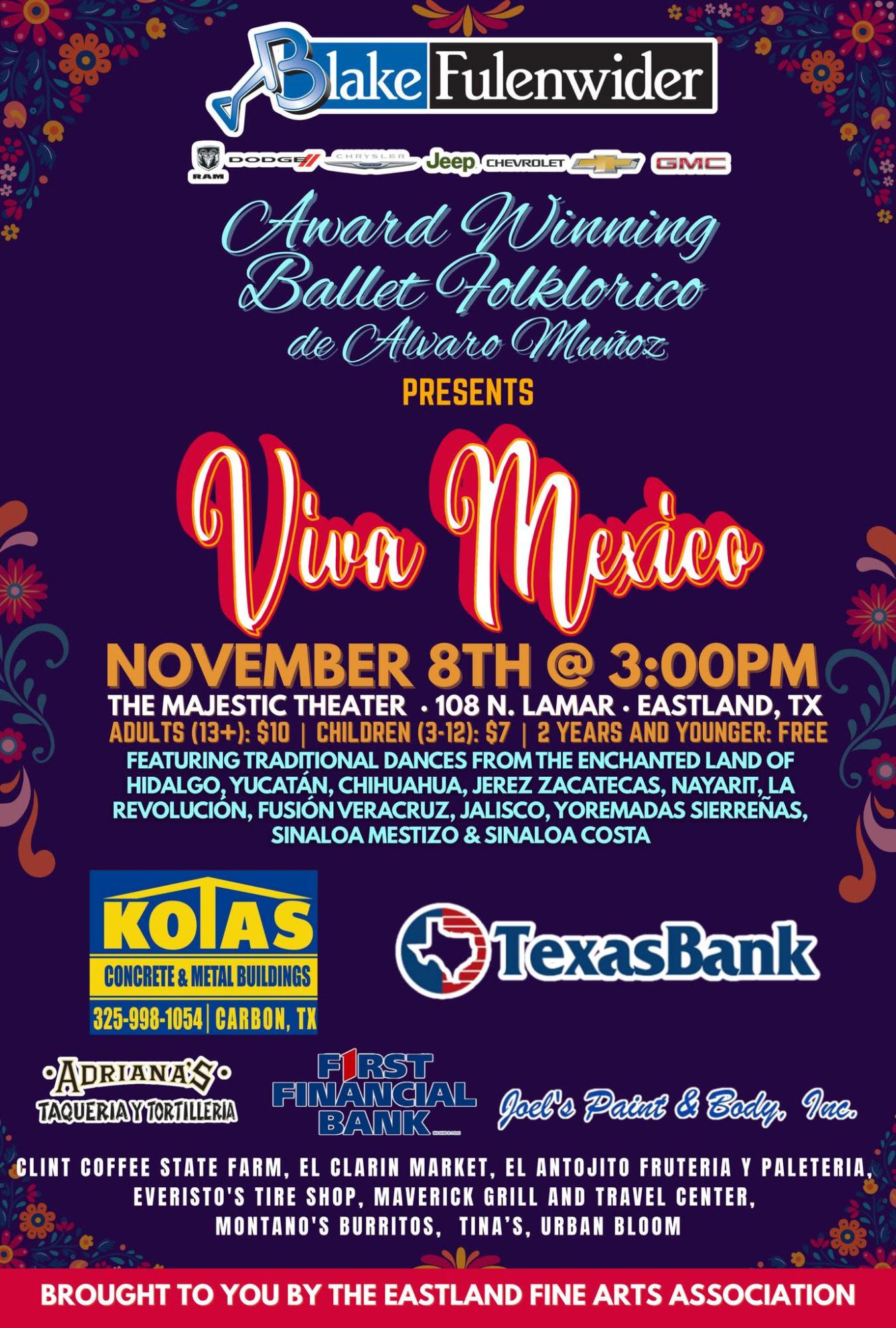 The Award-winning Ballet Folklórico de Alvaro Muñoz presents Viva México at the Majestic Theatre on Friday, November 8th at 3:00 PM.